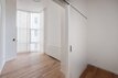 Zadní část bytu je orientovaná do klidného vnitrobloku a tvoří ji ložnice rodičů, ze které se vstupuje do samostatné místnosti, která může být zároveň pracovnou, šatnou i úložným prostorem. Díky šoupacím dveřím, připraveným rozvodům a chytře řešené komoře je tento prostor už teď plně připravený na jakékoli využití — kombinace home office a velkorysé rodinné šatny.